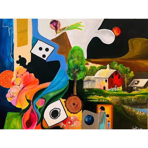 I use acrylic paints to disrupt the purity of blank canvas with realistic and abstract shapes. My attempt is to create bold, colorful and living pieces that pour my feelings and vision. Realistic blueberry and onion and abstract flowers demand to be examined. I focused on flowers that grow wild as well as the farmhouse. The energy, life and layers of colors, farmers (abstract and realistic), red planet (Mars) and intertwine layers of colors and shapes that play with focal points in and out.