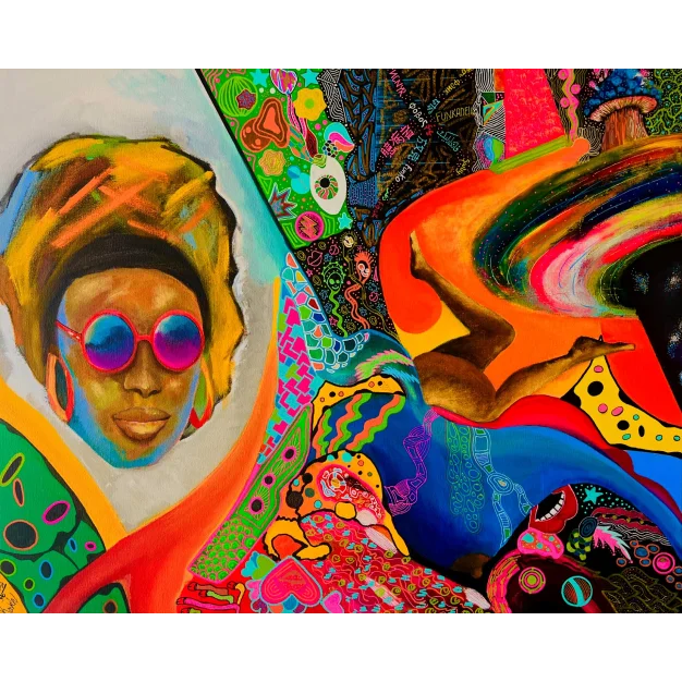 Funkadelic Virtuoso is a vivid journey—one that dives deep into the currents of identity, culture, and consciousness, all wrapped in a rich, psychedelic palette. At the heart of this piece is a striking portrait of a woman, her golden-yellow headwrap glowing like sunlight caught in fabric, and her reflective pink sunglasses offering a quiet, poised gaze amid the swirling chaos surrounding her. She stands as a calm anchor, a figure rooted in Afrocentric pride and timeless grace.