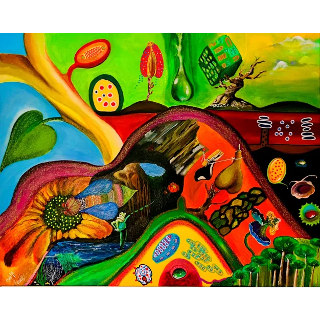 I captured in my own imagination this concept and lifecycle that may tell the story that starts with rain (water)- water droplet on top of the canvas, next and to the futuristic chlorophyl on an ancient tree. Lower part are the roots of the plant and insects that feed on plants. I added couple of my own artistic ideas to the story to make the concept a little interesting, magical and fun (like the pear on the tree that is waiting for her underwear to dry :)) and frog is resting on aquatic flower stem after a long day, as well as magical flower blooming on right hand side above the forest)