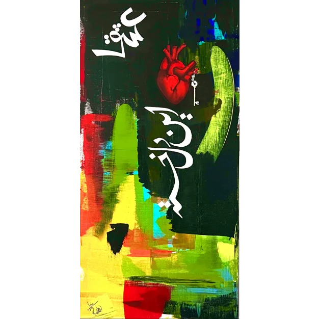 My tired heart is a combination of abstract and Farsi calligraphy. There are two words, the one on top left side is ESHGH (means love in Farsi) and the one in the center is EEN DELEH KHASTEH (means the tired heat). The key is hanging on the right side of the heart symbolizing the fact that someone one day might be able to use the key and capture the love you offer! Are you the one?