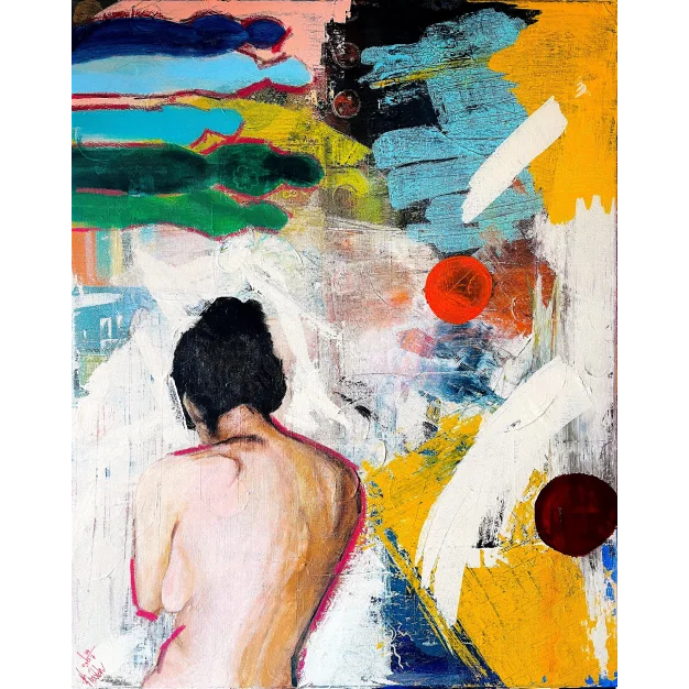 Red Light District prides itself on its liberal and tolerant attitude, as I tried to capture it in this painting by adding lines, scratches and paint drips. Embracing that many people go to this part of town, looking for prostitution, soft drugs and pornography. And that it is because we are only humans, good or bad, we are what we are. The painting captured being inside the house behind the prostitute (her back toward me) looking outside where people gather. The upper left hand side represent figures (people) walking, stopping by and watching.