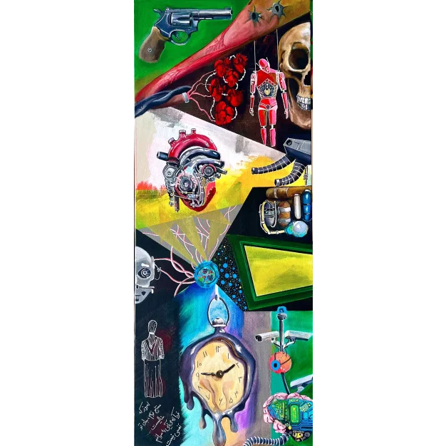 Tocchi surreali – un orologio che si scioglie drappeggiato su un cilindro blu elettrico e una figura robotica pixelata – spingono la narrazione oltre il mondo materiale, evocando il passaggio incessante del tempo e il futuro incerto plasmato dall'innovazione e dai cambiamenti ambientali. L'inclusione di vetri scientifici e forme geometriche ancorano ulteriormente il pezzo nel regno dell'indagine e del cambiamento umano, mentre i colori vividi iniettano energia e urgenza senza perdere chiarezza o scopo.