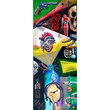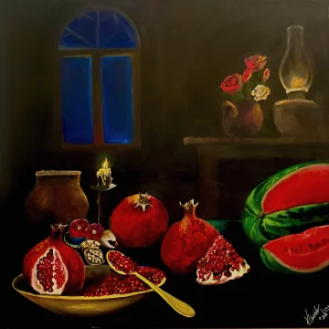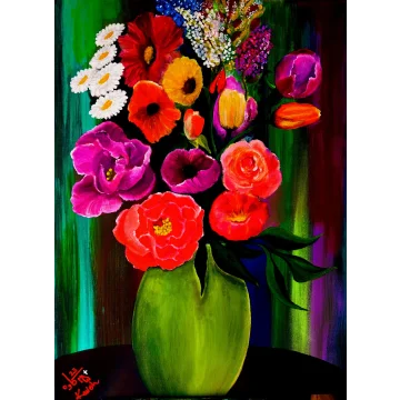 Impostata su uno sfondo di tonalità calde e luminose, l'opera cattura un delicato equilibrio di energia – tra luce e ombra, immobilità e vita. I gigli sovradimensionati e il fogliame avvolgente migliorano questa sensazione di essere sia radicati che avvolti all'interno di un ecosistema vivente. Questa combinazione di elementi surreali con il familiare invita a riflettere su come la cura e l'attenzione creano spazio per il rinnovamento, non solo nella natura ma anche dentro di noi.